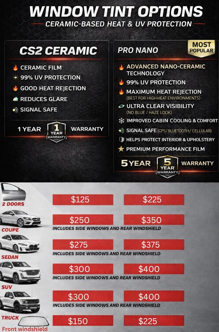 I exclusively work with premium ceramic window tint and do not offer carbon or standard film options.